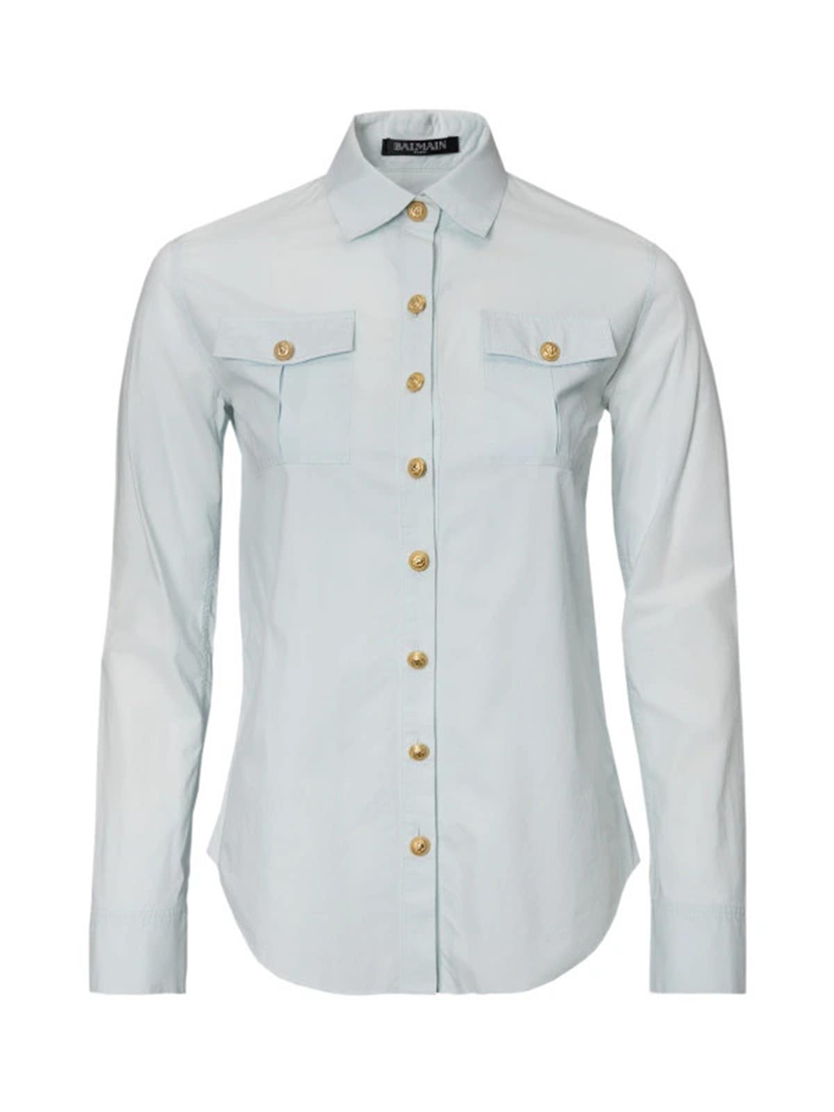Рубашка BALMAIN 36FR голубая шелк золотые пуговицы
