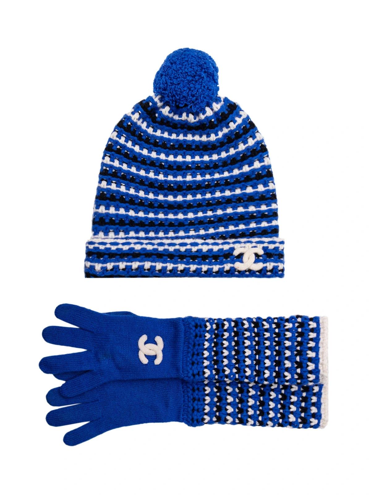 Шапка CHANEL синяя белое лого+перчатки кашемир