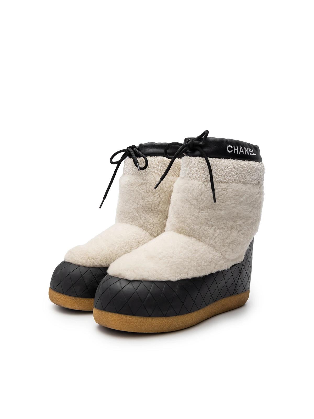 Ботинки CHANEL EU 40 белые овчина мех кожа черный резиновый кант пыльники