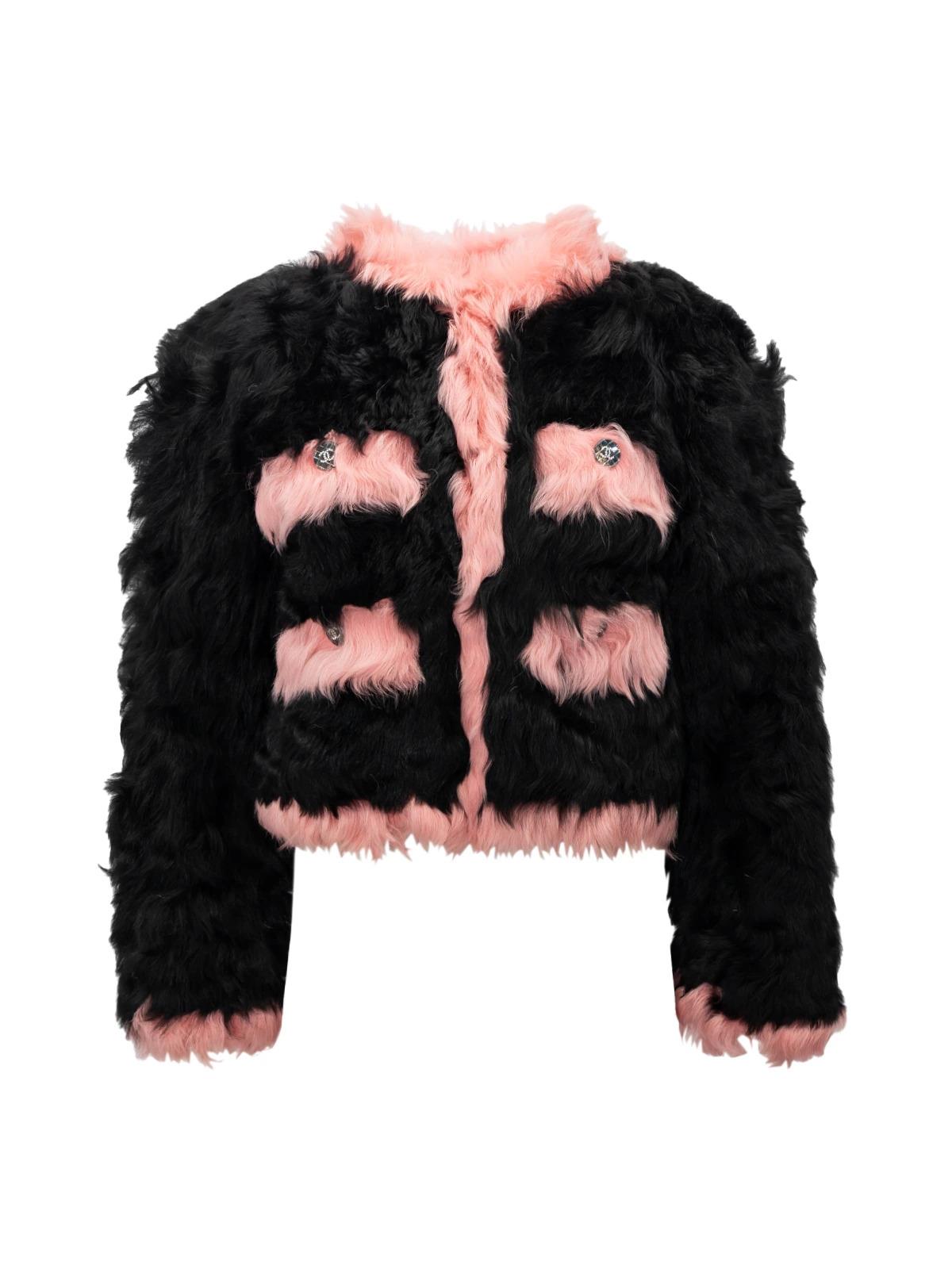 Пиджак CHANEL FR 36 черная шерсть розовая отделка жакет мех стриженный ягненок