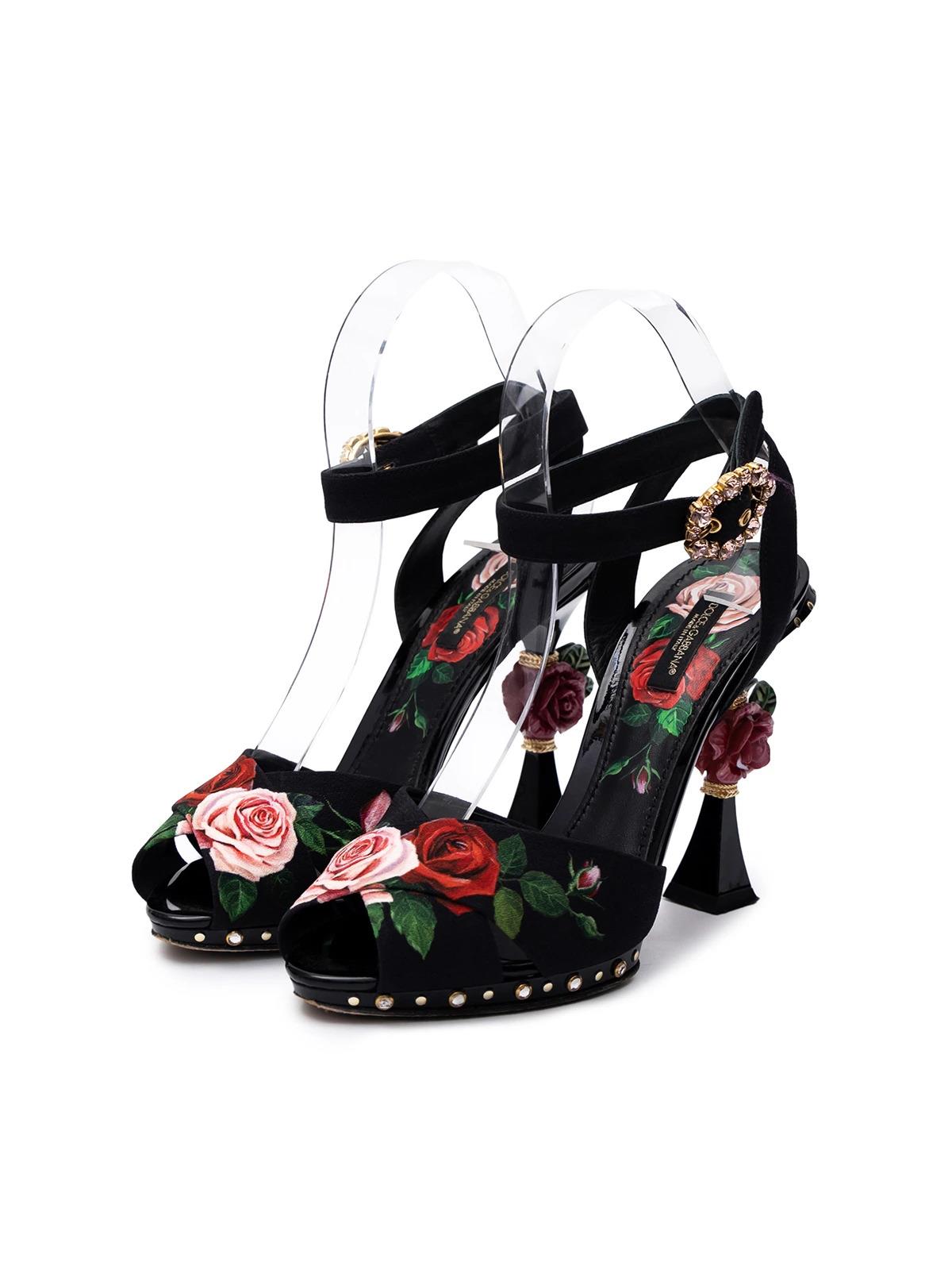Босоножки DOLCE & GABBANA EU 38 черные ткань розы каблук вставка розочка