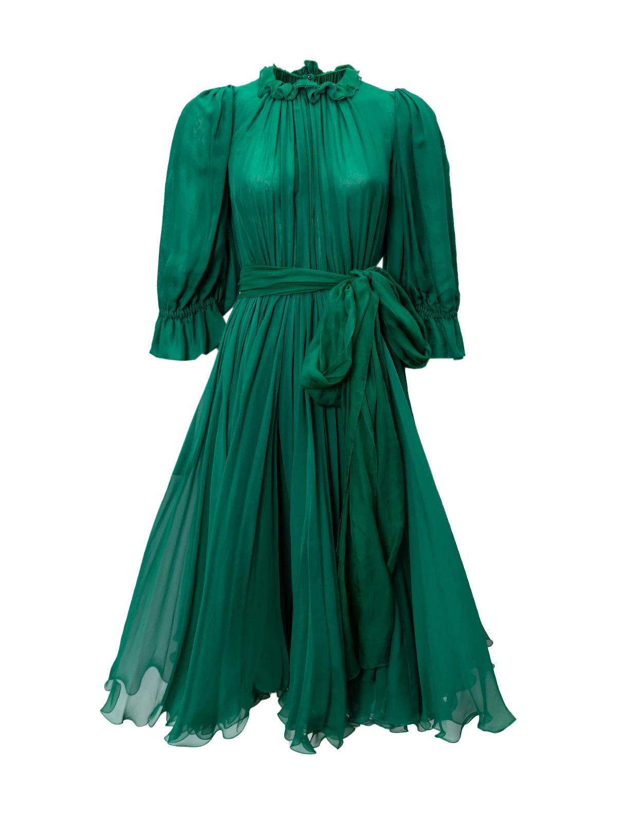 Платье DOLCE & GABBANA IT 38 зеленое шелк миди с поясом рукава ворот с воланами
