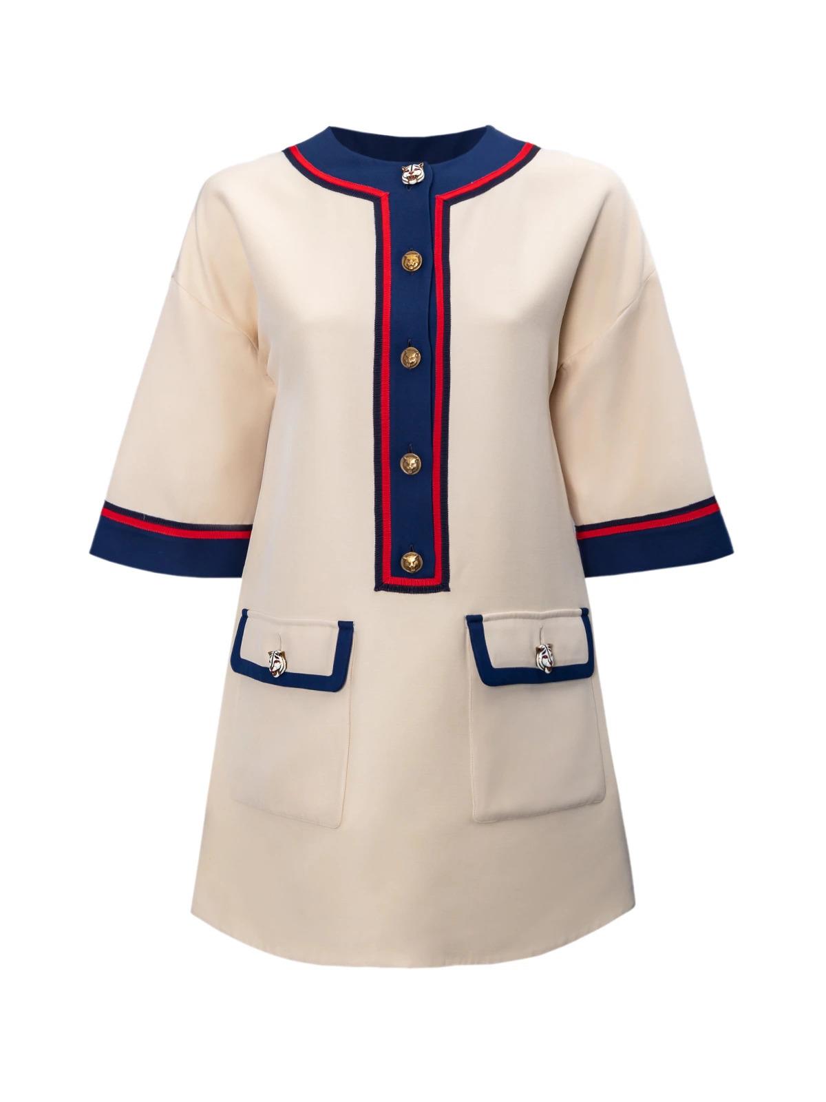 Платье GUCCI IT 42 бежевое рукава 3/4 синий красный кант тигры пуговицы шерсть