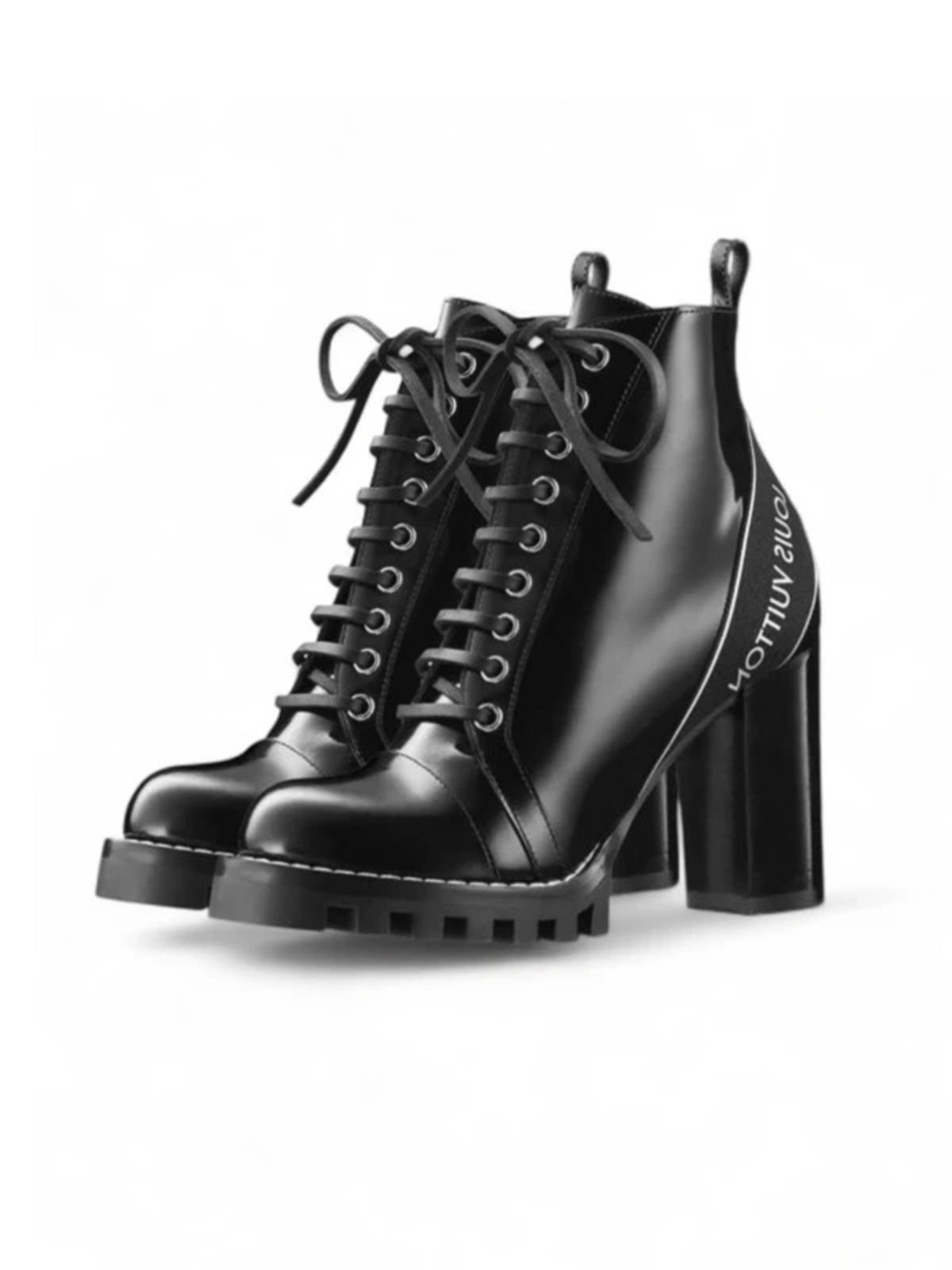 Ботильоны LOUIS VUITTON 38 черные кожа белое лого шнурки прострочка массивный каблук