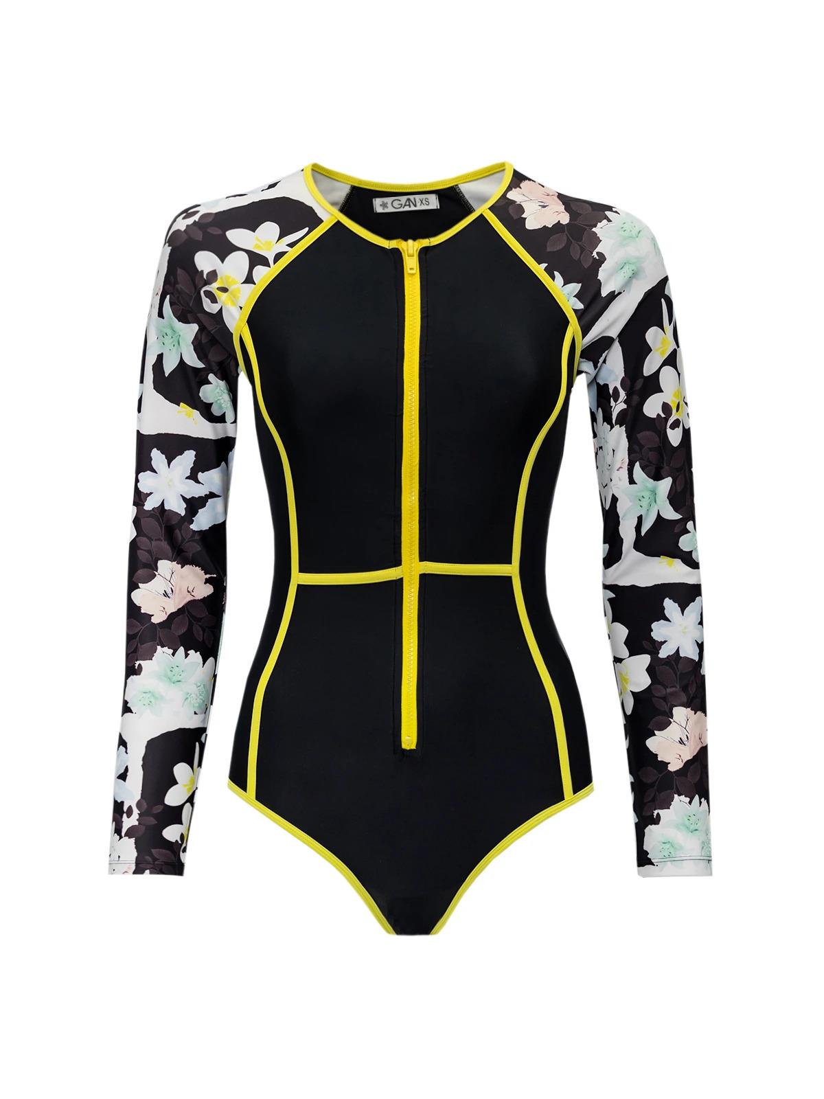 Купальник NO NAME INT XS черный желтая окантовка рукава цветы полиэстер